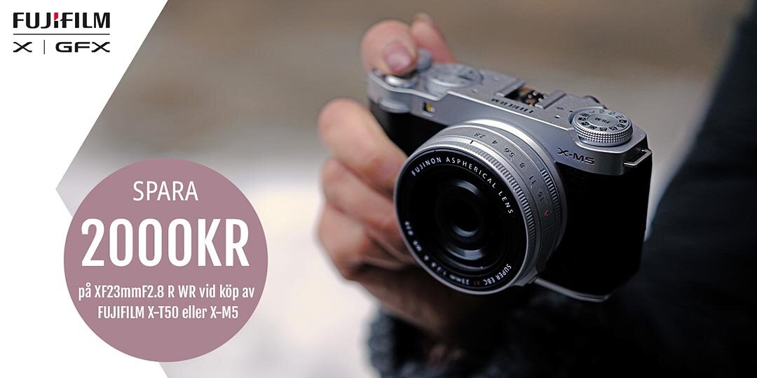 Få 2000kr rabatt när du köper Fujifilm X-T50 eller X-M5 tillsammans med XF 23/2,8 R WR. Gäller t.o.m. 2026-03-31.